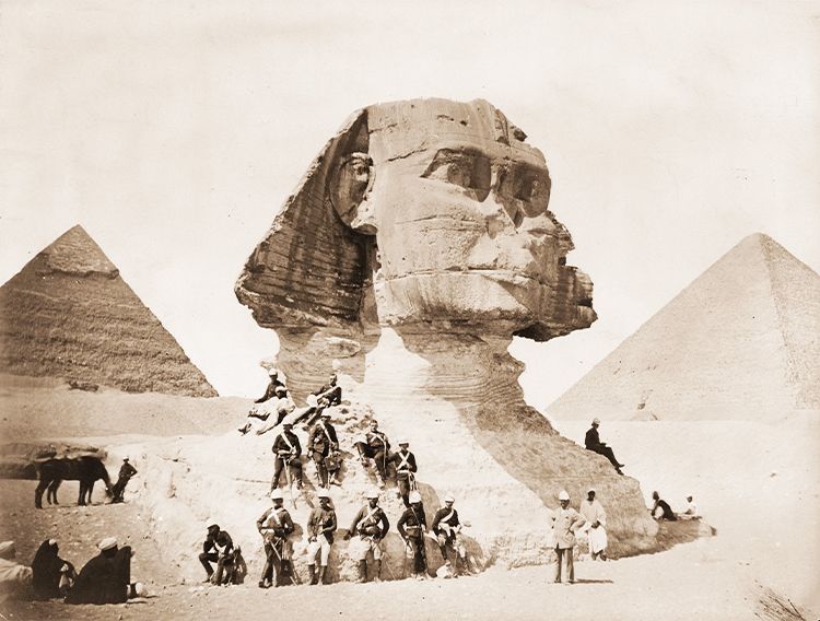 Des troupes britanniques posent près du Grand Sphinx de Gizeh après le bombardement d'Alexandrie par les navires de la Royal Navy en 1882, qui a détruit de grandes parties de la ville antique. (Getty Images)