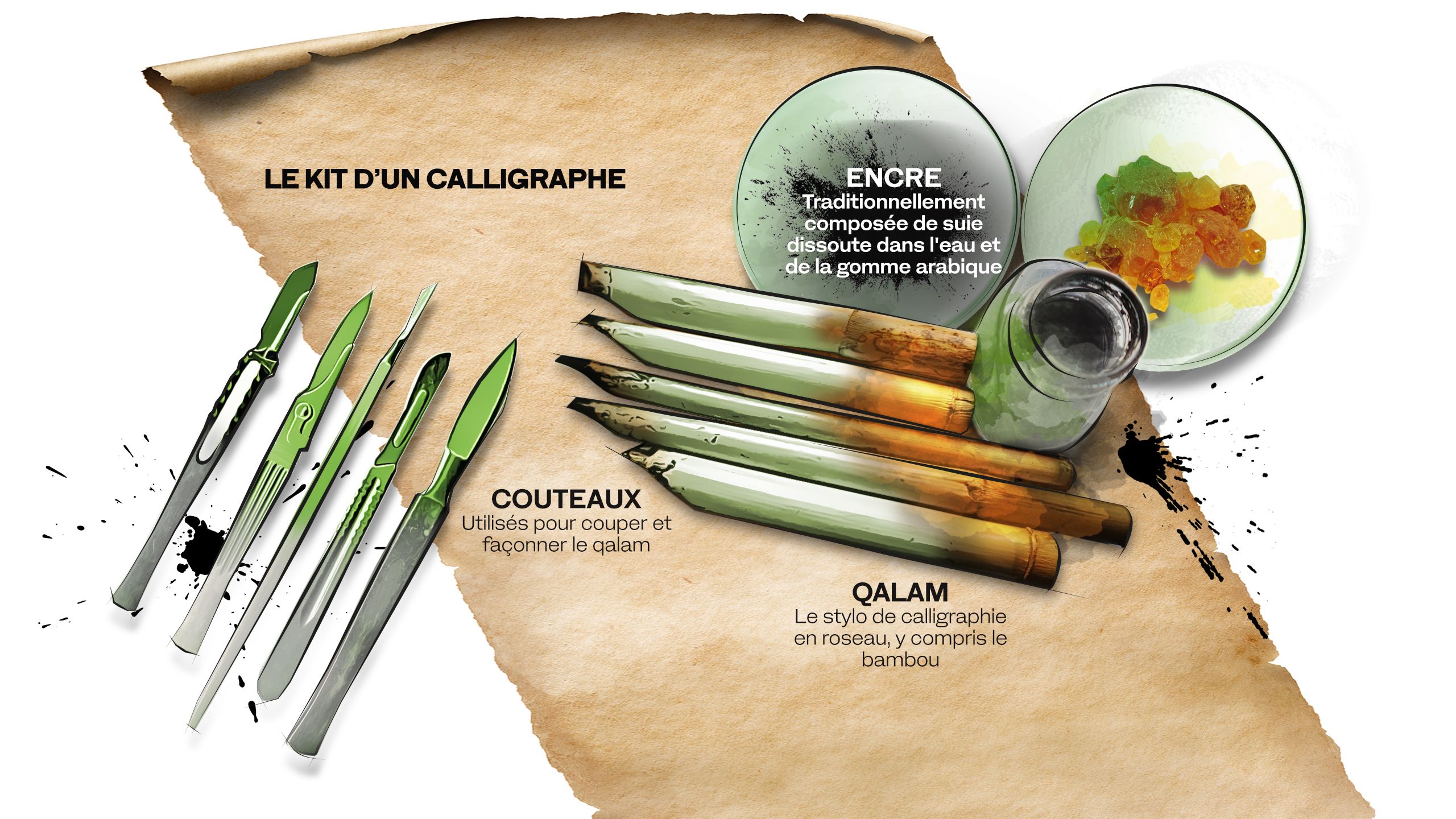 «Dans les livres de calligraphie traditionnels, des dizaines de pages décrivent la plume de roseau et la manière dont elle est coupée, entaillée, séchée et conservée», affirme M. Sayegh, dont le studio à Beyrouth comprend des encriers, des pinces, des pinces coupantes, une scie à métaux, deux maillets en bois et une vieille perceuse manuelle. «Des dizaines de pages décrivent aussi le couteau que le calligraphe doit utiliser pour fabriquer la plume. De nombreuses autres pages décrivent les encres et la façon de les produire et de les préparer.»