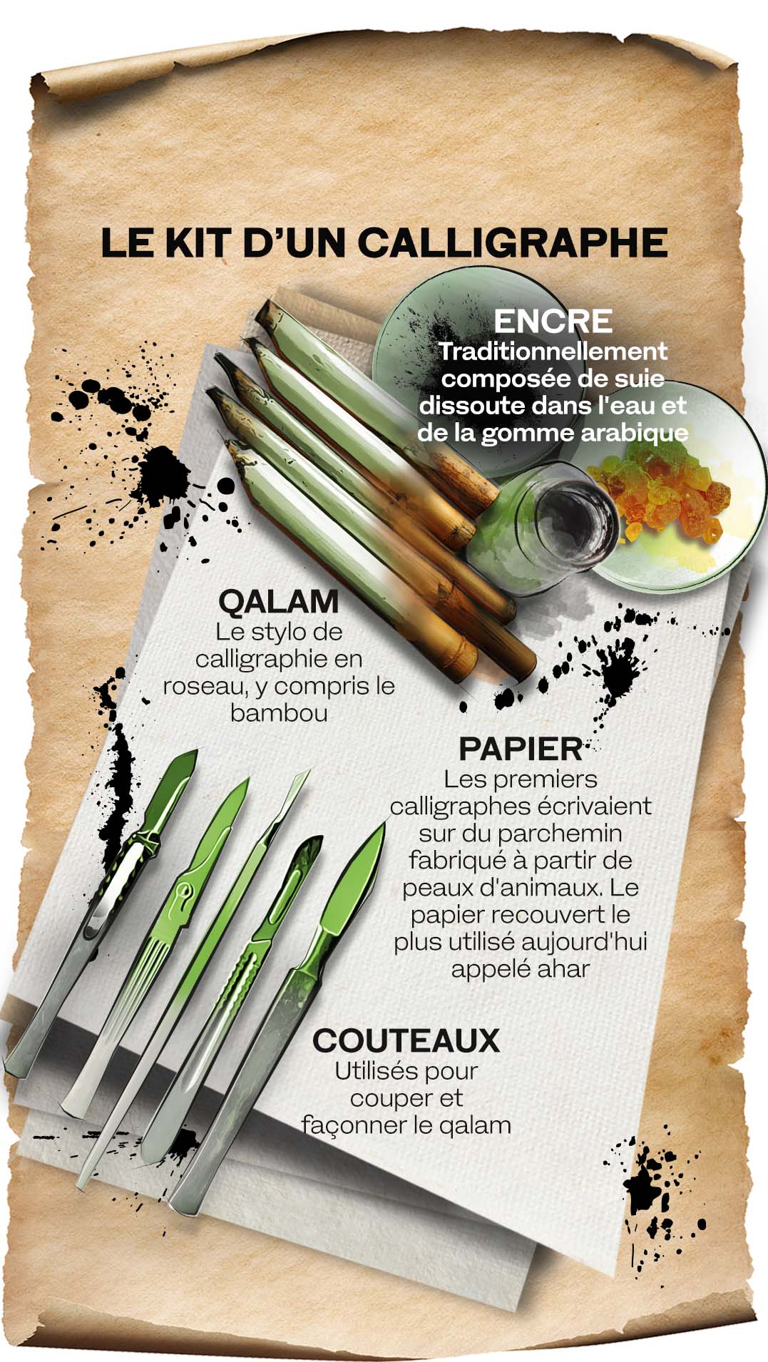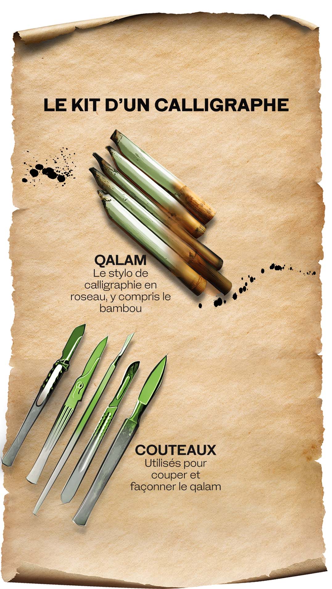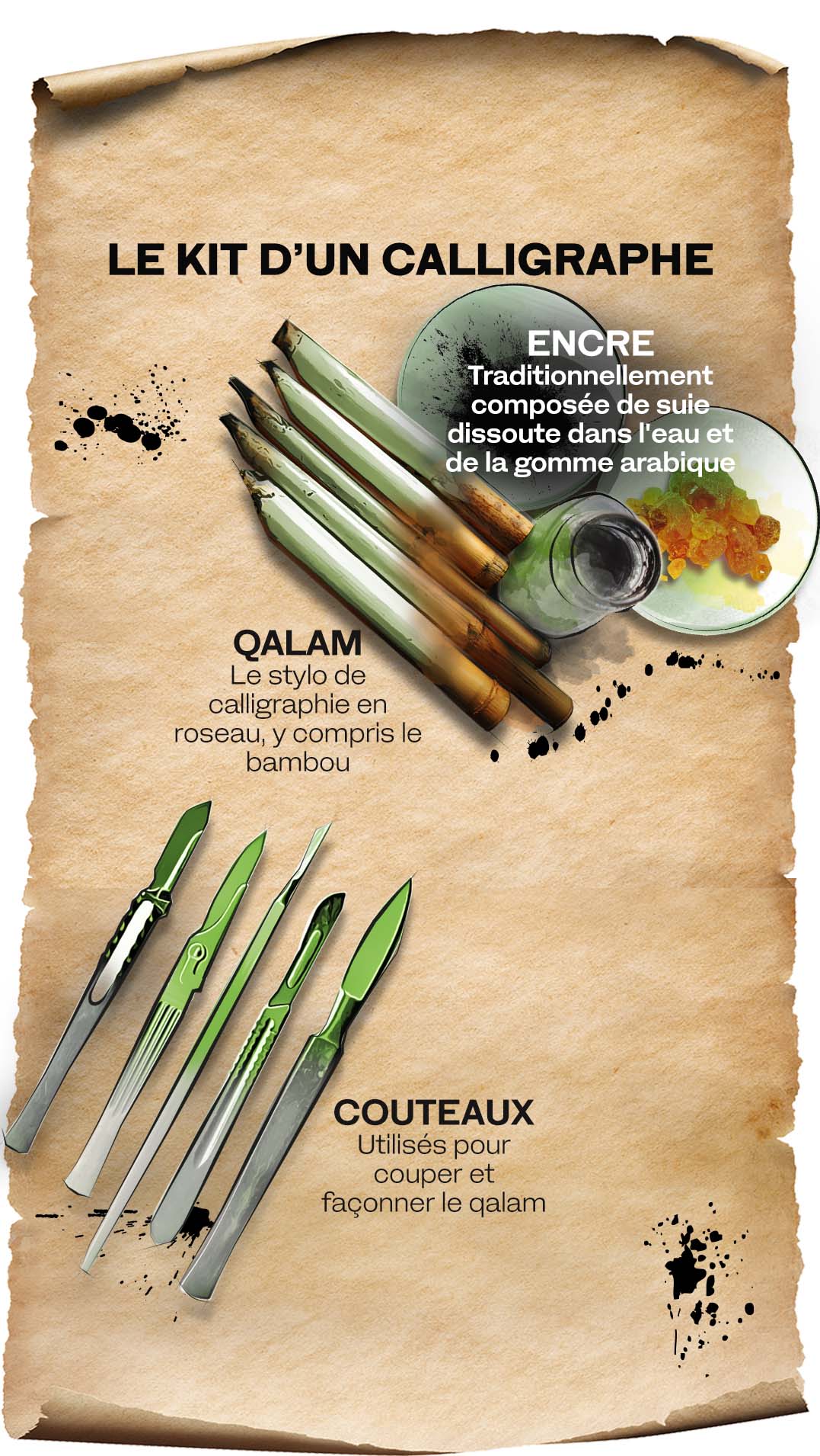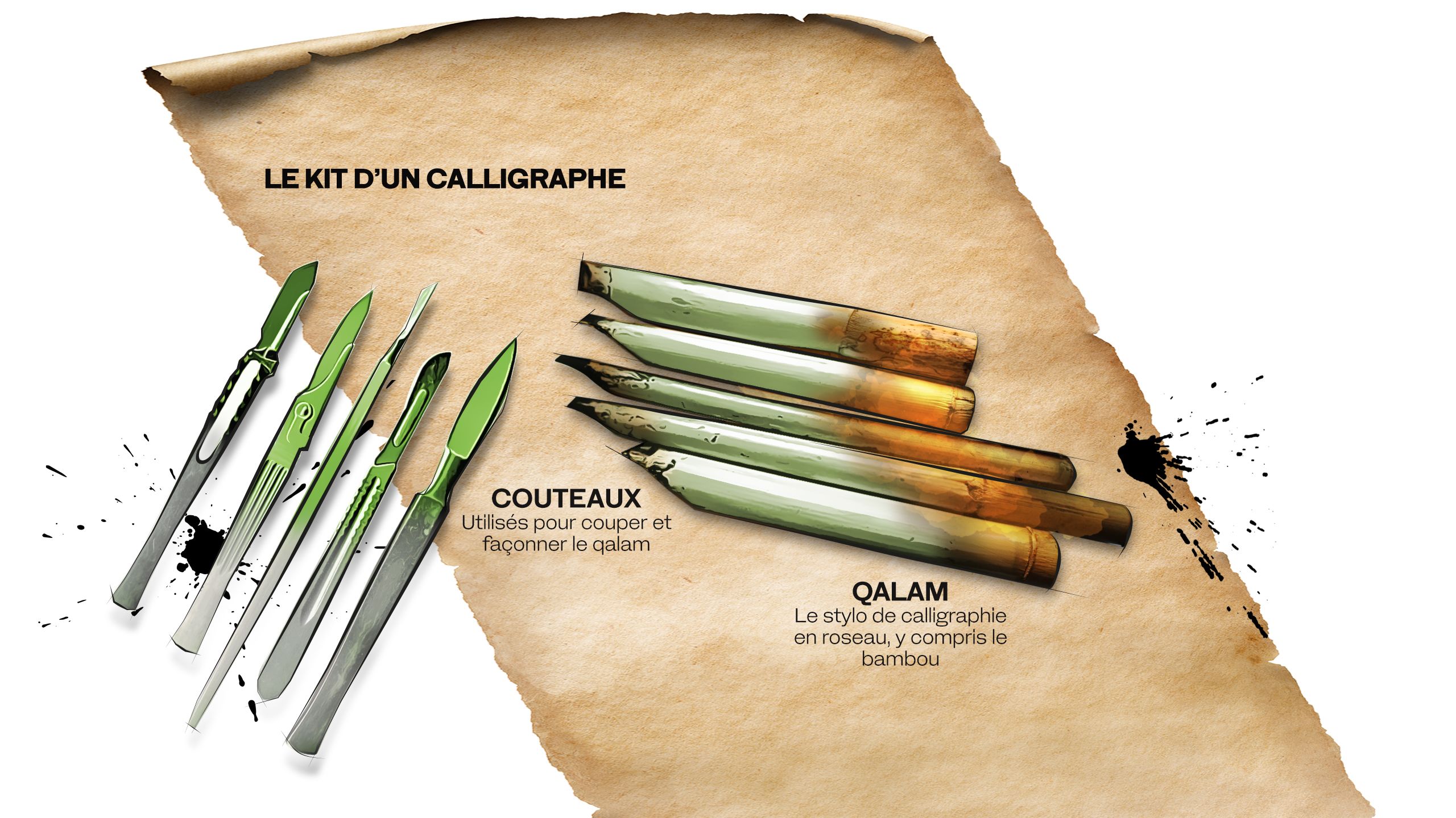 Les plumes de roseau ont été choisies parce qu’elles combinent dureté et souplesse, solidité et flexibilité, et permettent à l’encre de bien s’écouler sur la surface du papier. De nombreux accessoires, tels que des plumiers et des encriers, ornent le bureau d’un calligraphe, tandis que la calligraphie réalisée sur d’autres matériaux, comme le métal ou le bois, nécessite une sélection d’outils de sculpture.