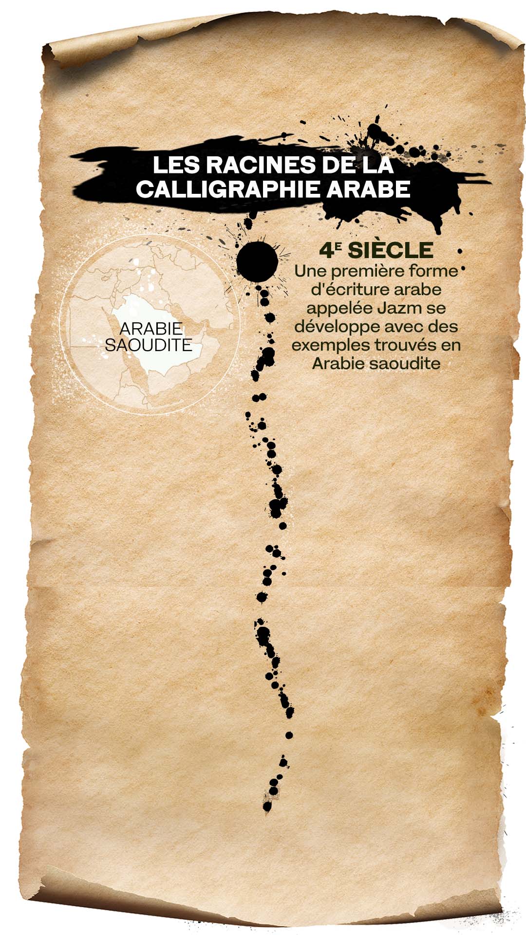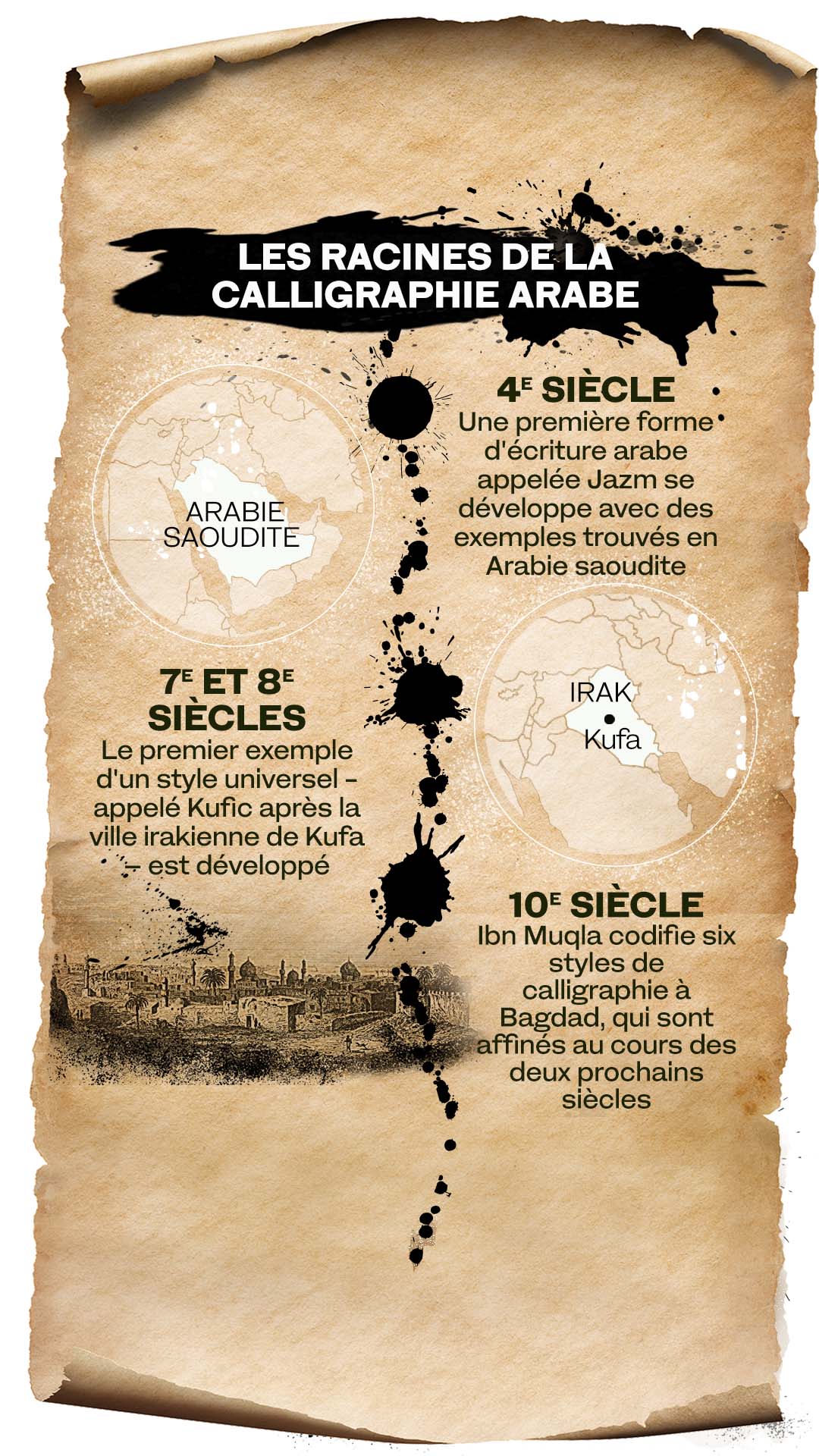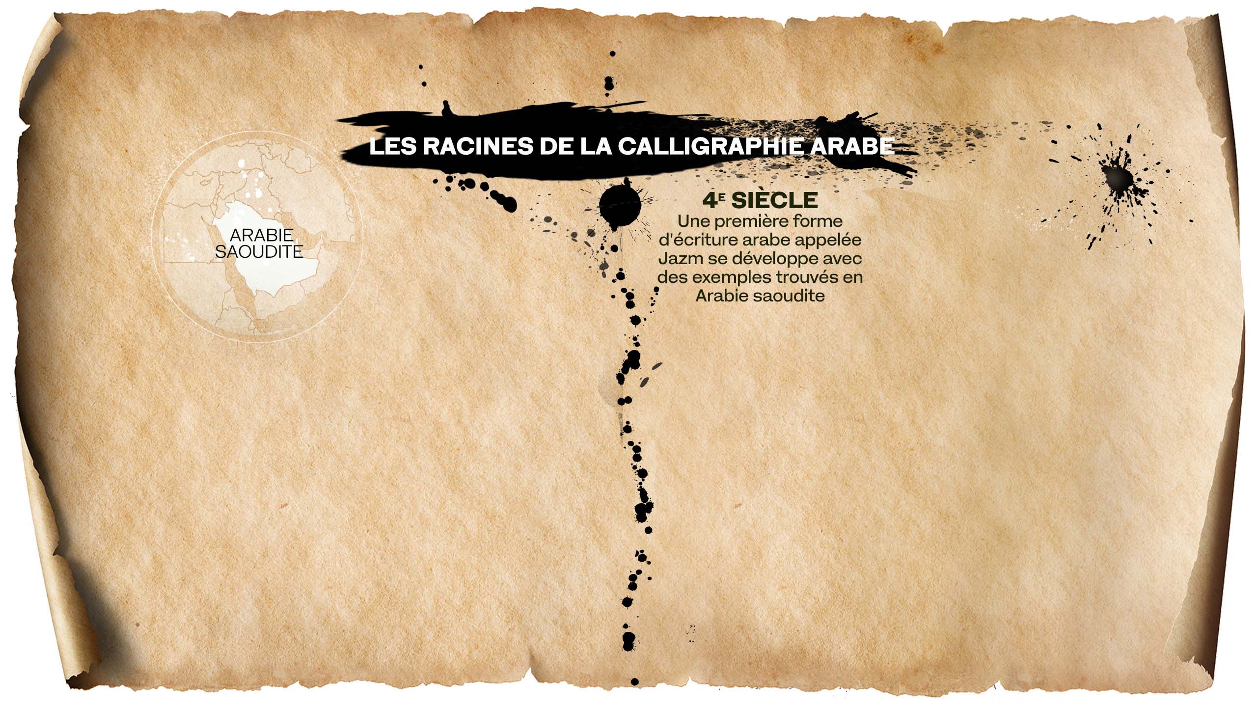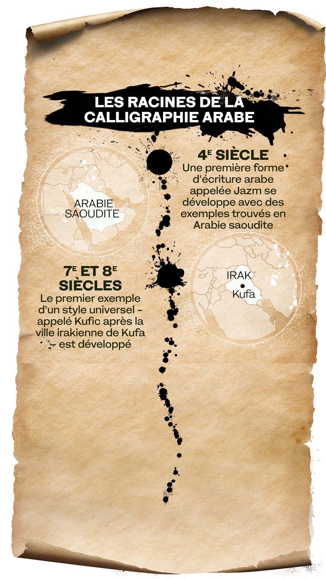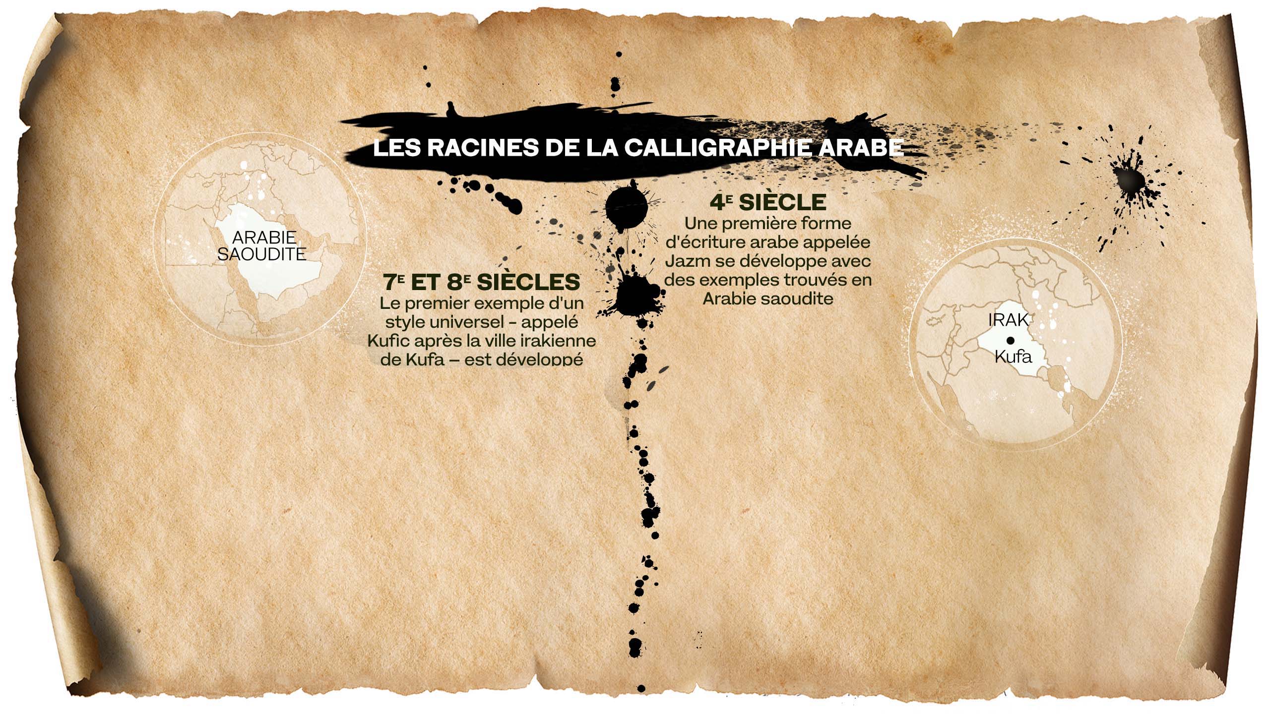L'art de la calligraphie arabe s'est perfectionné et développé au cours des millénaires. La calligraphie est la manifestation de la parole de Dieu, elle a aidé à préserver la connaissance et la compréhension humaines, et a aussi été témoin de la destruction de Bagdad. Elle a été codifiée, stylisée et s’est prêtée à l'abstraction. Elle a même lutté pour exister dans le monde moderne et elle est parvenue à se renouveler à travers l'art et la typographie.