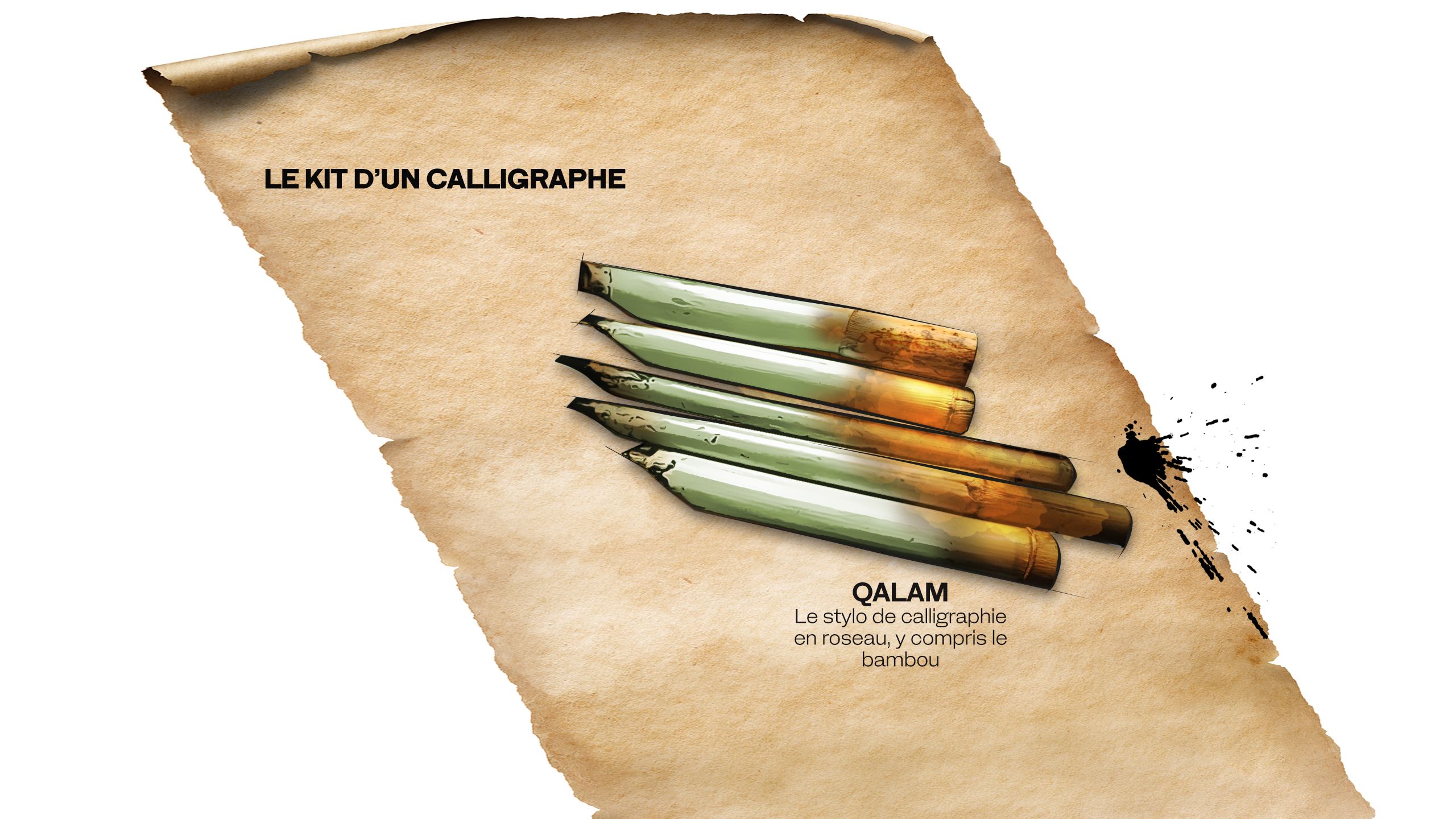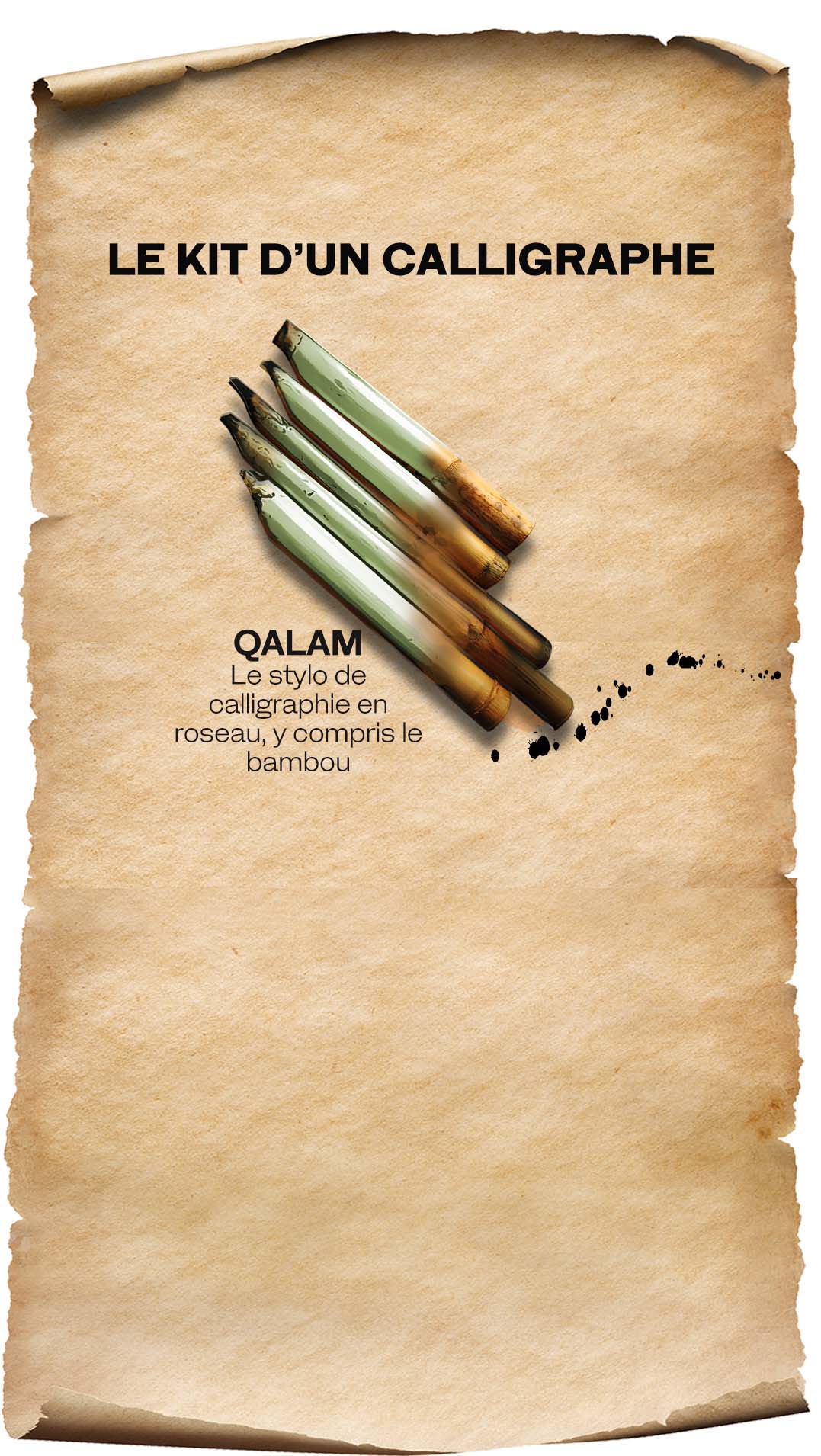 Dans les livres de calligraphie traditionnels, des dizaines de pages décrivent la plume de roseau et la manière dont elle est coupée, entaillée, séchée et conservée.