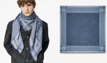 Louis Vuitton propose une écharpe à carreaux bleus, décorée de son monogramme et du motif palestinien caractéristique