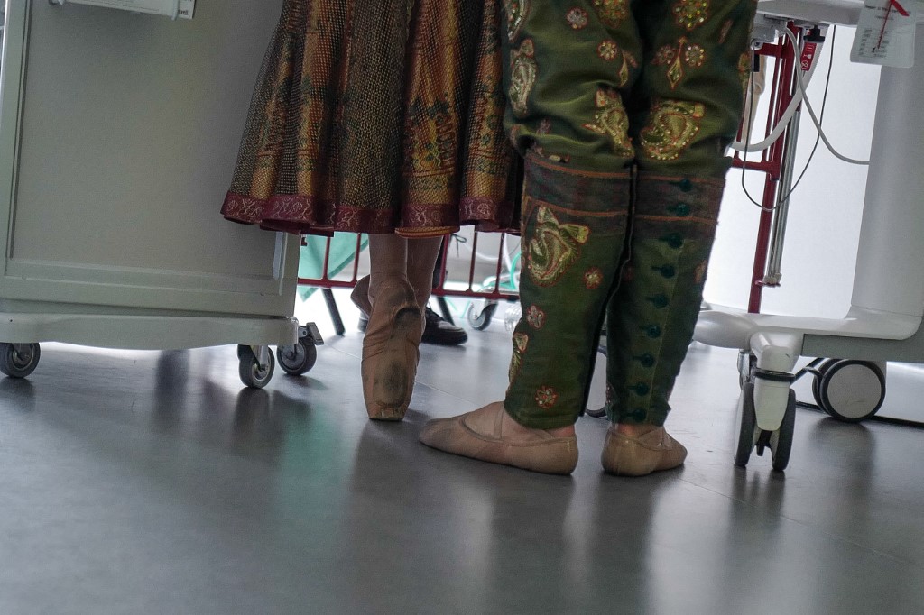 De salle en salle, les étoiles, un rien émues, vêtues de costumes verts et dorés d'un grand ballet académique, "La Bayadère", et de masques chirurgicaux, plaisantent avec les soignants et expliquent leur métier. "C'est comme Jasmine et Aladdin. Et dans le deuxième acte, je me marie et j'arrive sur un énorme éléphant, tu t'imagines?", lance Hugo à un petit garçon amusé.