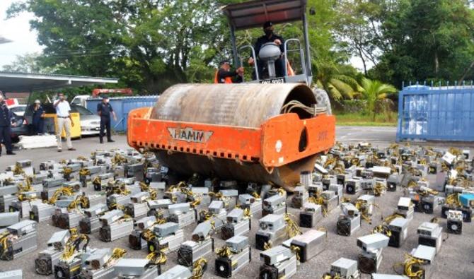 Cette photo prise le 16 juillet 2021 montre la police au siège de la police du district de Miri surveillant la destruction de machines d'extraction de bitcoins écrasées au rouleau compresseur, dans la ville malaisienne de Miri à Bornéo. (Dennis Wong / Avec l'aimable autorisation de Dennis Wong / AFP)