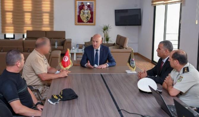 Le président Kais Saied (au centre) rencontre les commandants de l'unité spéciale de la Garde nationale tunisienne à Bir Bou Rekba dans l'État de Nabeul, à environ 60 kilomètres au sud de la capitale, le 4 août 2021. (Photo, AFP)