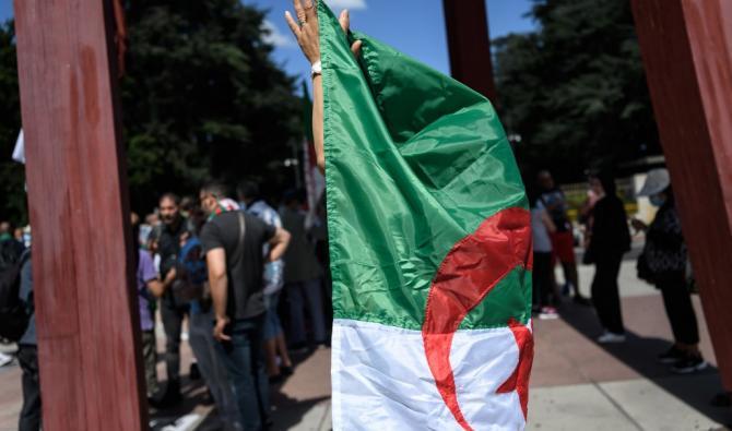 Une femme portant un drapeau algérien sur les épaules, lors d'une manifestation devant les bureaux des Nations Unies à Genève, contre les "arrestations arbitraires" en Algérie, le 23 août 2020. (Photo, AFP)