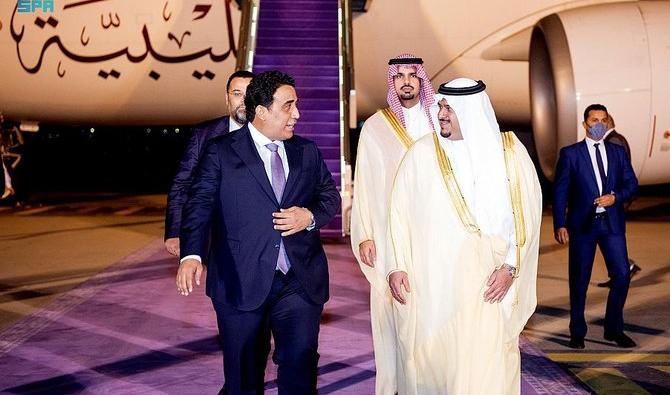 Le Président du Conseil présidentiel libyen, Mohammed Al-Menfi, arrive à l’aéroport international de Riyad, le dimanche 24 octobre 2021. (SPA)