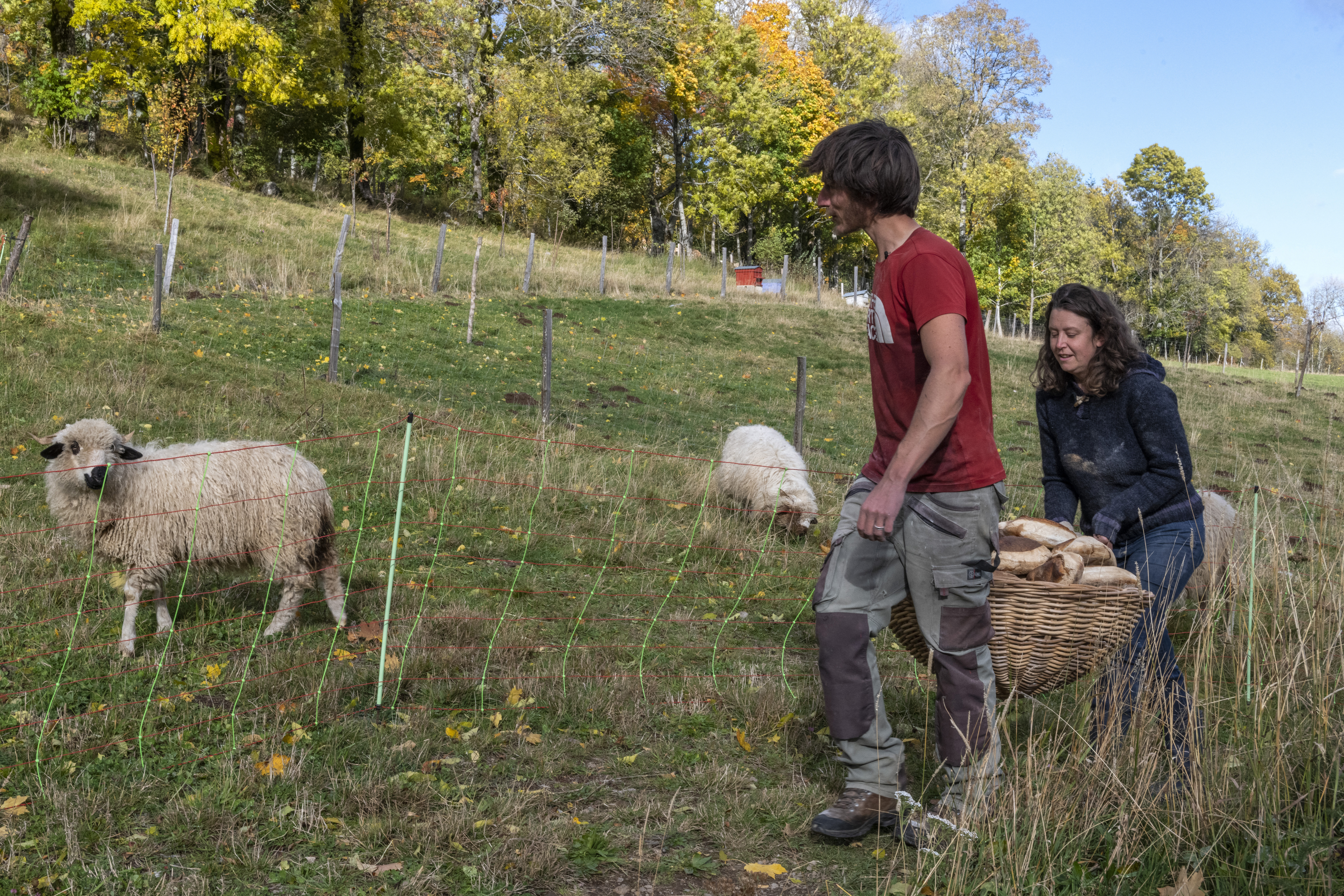 "On n'est pas auto-suffisant à 100%, mais on arrive à avoir nos légumes, nos produits laitiers, nos oeufs, la viande, le miel", détaille son époux Thibault, 37 ans lui aussi, architecte passé par le cabinet de Jean Nouvel.
