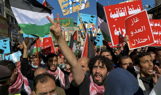 Environ 3 000 manifestants se sont rassemblés vendredi dans le centre-ville d'Amman pour protester contre l'accord avec Israël. Beaucoup tenaient des pancartes portant les noms des étudiants détenus.