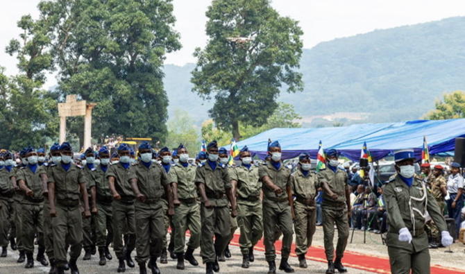 Défilé des forces armées centrafricaines pour célébrer le 61e anniversaire de l'indépendance au Camp Kasaï à Bangui, le 13 août 2021. (AFP)