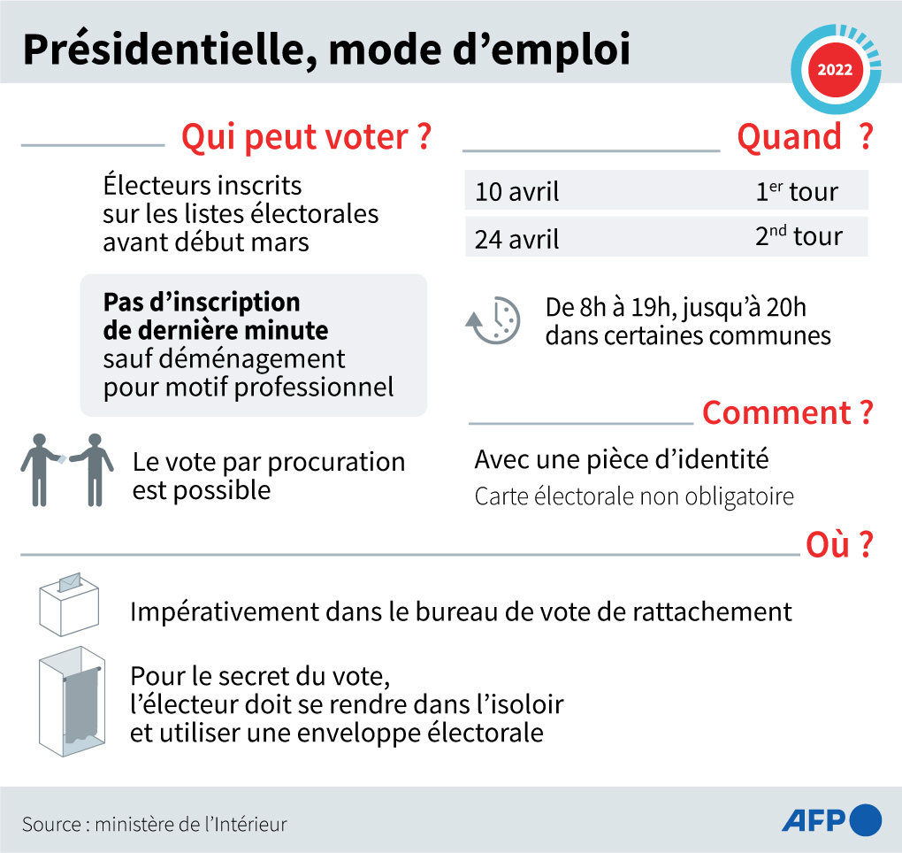 Le 1er tour aura lieu le 10 avril, sauf en Guadeloupe, en Martinique, en Guyane, à Saint-Pierre-et-Miquelon, à Saint-Barthélemy, à Saint-Martin et en Polynésie française, où les électeurs votent la veille pour tenir compte du décalage horaire et qu’ils n’aient pas connaissance du résultat du vote en métropole. Le 2nd tour aura lieu le 24 avril 2022 (la veille pour certains électeurs habitant dans un fuseau horaire différent).