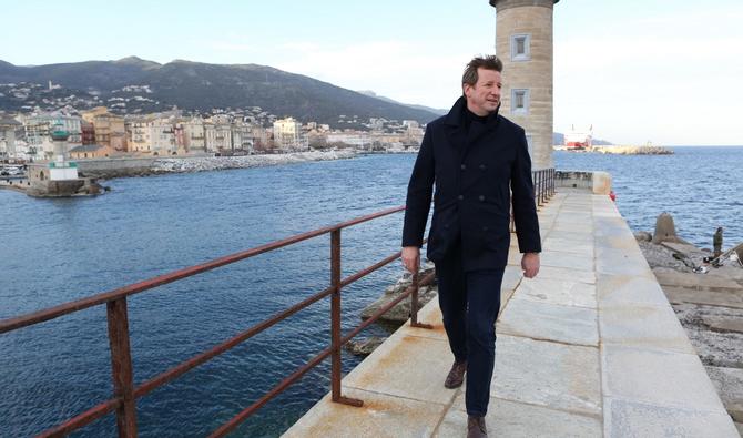 Le candidat du parti français Europe Ecologie Les Verts (EELV) à l'élection présidentielle française de 2022, Yannick Jadot, marche le long du mur habrour face à Bastia, sur l'île méditerranéenne française de Corse, le 31 janvier 2022. (AFP)