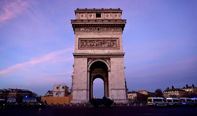Des camions de la police française garés autour de l'Arc de Triomphe sur la Place Charles De Gaulle à Paris, le 12 février 2022, alors que des convois de manifestants entrent dans la capitale française (AFP).