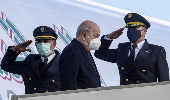Le président algérien Abdelmajid Tebboune (C) débarque de son avion à son arrivée à l'aéroport international Tunis-Carthage desservant la capitale tunisienne le 15 décembre 2021. (AFP)