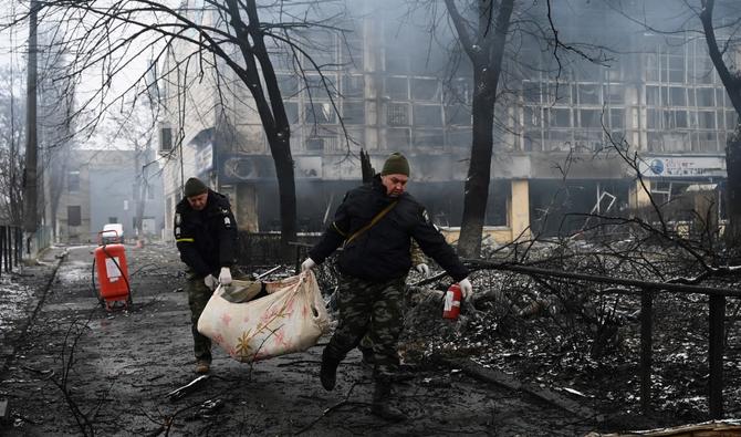 Des policiers retirent le corps d'un homme mort lors de la frappe aérienne de Kiev le 2 mars 2022 (Photo, AFP).