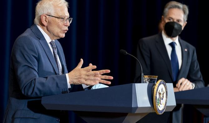 Le haut représentant de l'Union européenne pour les affaires étrangères et la politique de sécurité, Josep Borrell, accompagné du secrétaire d'État Antony Blinken, à droite, prend la parole lors d'une conférence de presse au département d'État à Washington, le 7 février 2022 (Photo, AFP).