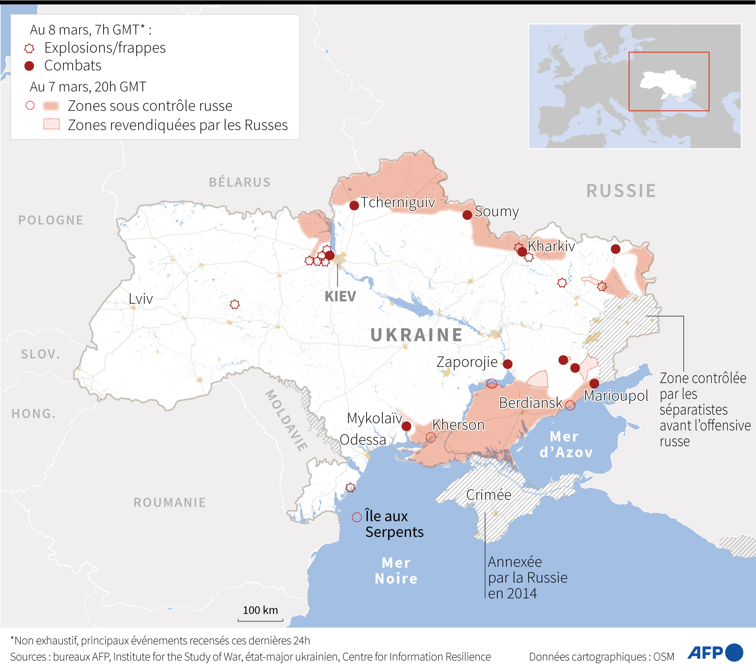 De violents combats ont aussi eu lieu dans la ville d'Izioum (est), mais les troupes russes ont battu en retraite, selon l'état-major ukrainien. Les forces russes "ont fait régner la terreur dans la ville, en bombardant les locaux et les infrastructures civils", a-t-il ajouté.