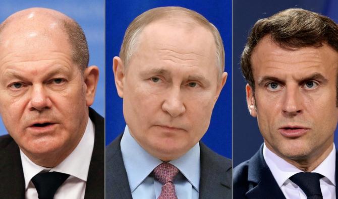 De gauche à droite, Olaf Scholz, Vladimir Poutine et Emmanuel Macron (Photo, AFP).