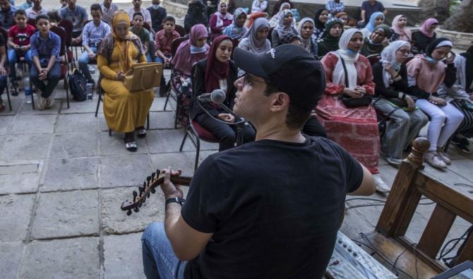 Ce «mounchid» (chanteur religieux) fait répéter des hommes et femmes réunis dans la vaste cour du palais mamelouk de Taz, dont les murs, les piliers et les portes épurées témoignent d'une riche histoire islamique.