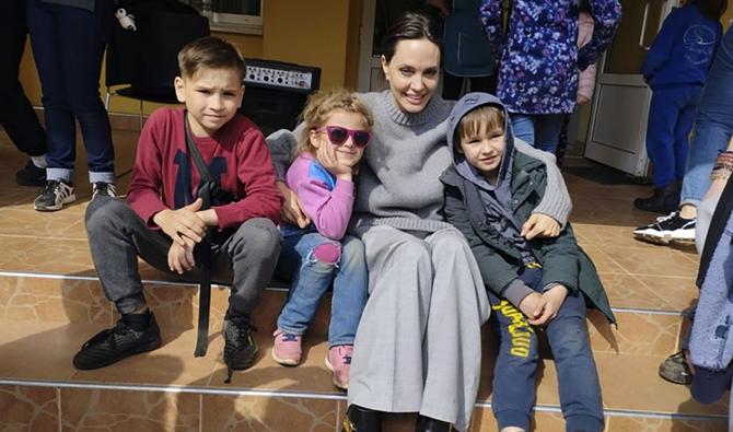 L'actrice américaine et envoyée spéciale du HCR Angelina Jolie pose pour une photo avec des enfants, alors que l'attaque de la Russie contre l'Ukraine se poursuit, à Lviv, en Ukraine, le 30 avril 2022. (Service de presse de l'administration régionale de Lviv via REUTERS)