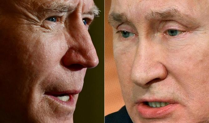 Joe Biden s'exprimant dans la salle à manger d'État de la Maison Blanche à Washington le 20 janvier 2021 et le président russe Vladimir Poutine tenant sa conférence de presse le 7 décembre 2021 (Photo, AFP).