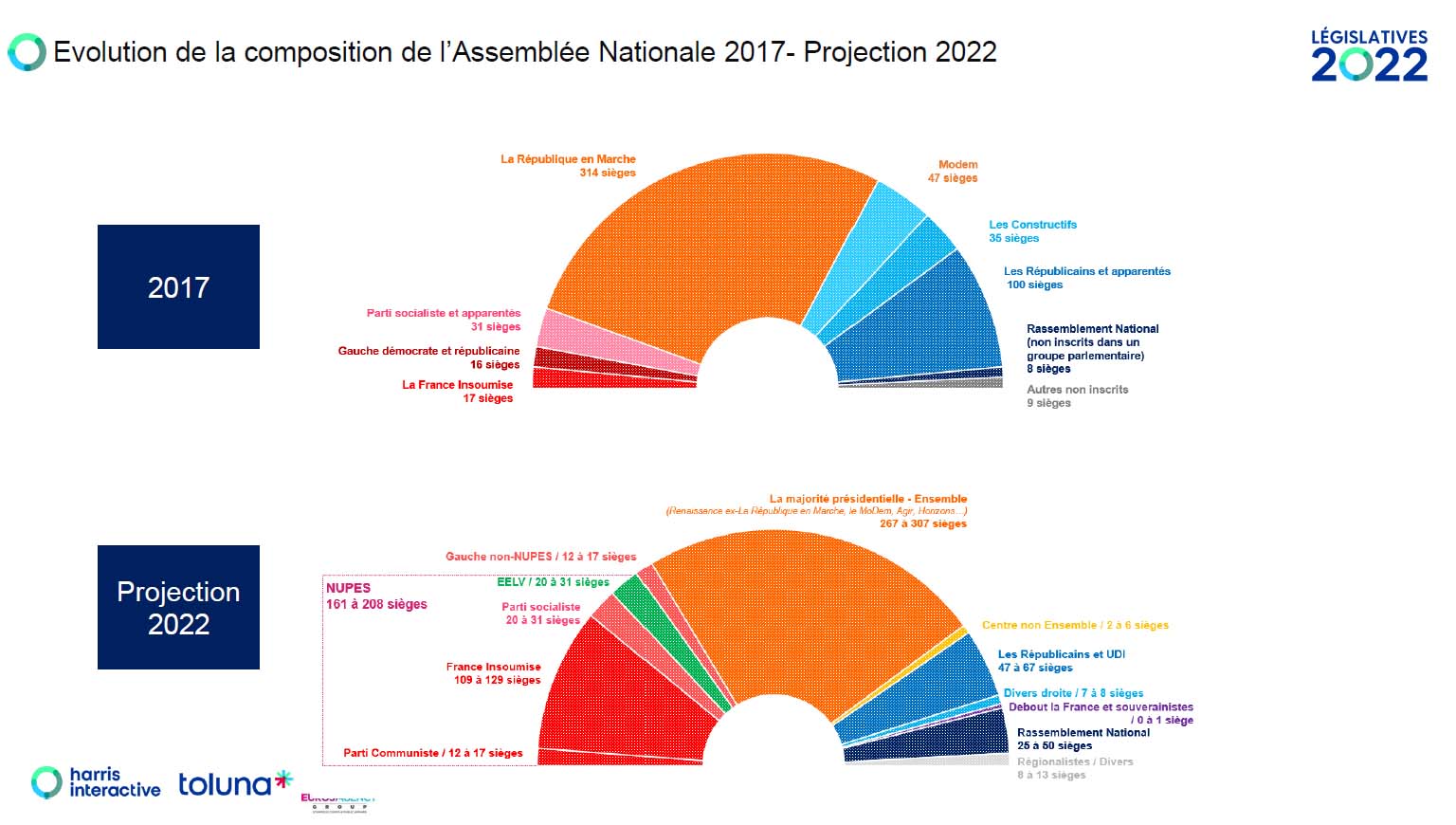 La majorité restera acquise au président de la République, mais ne sera pas une majorité absolue. La cohabitation, selon les sondeurs, n’est pas à l’ordre du jour, mais les candidats de la gauche unis au sein de la Nouvelle union populaire écologique et socialiste (NUPES) constitueront une force d’opposition significative.