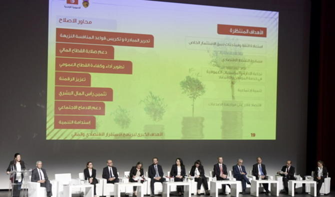 Le ministre tunisien des Finances, Sihem Boughdiri Nemsia (à gauche), présente les nouvelles réformes économiques lors d'une conférence de presse à Tunis (Photo, AFP).