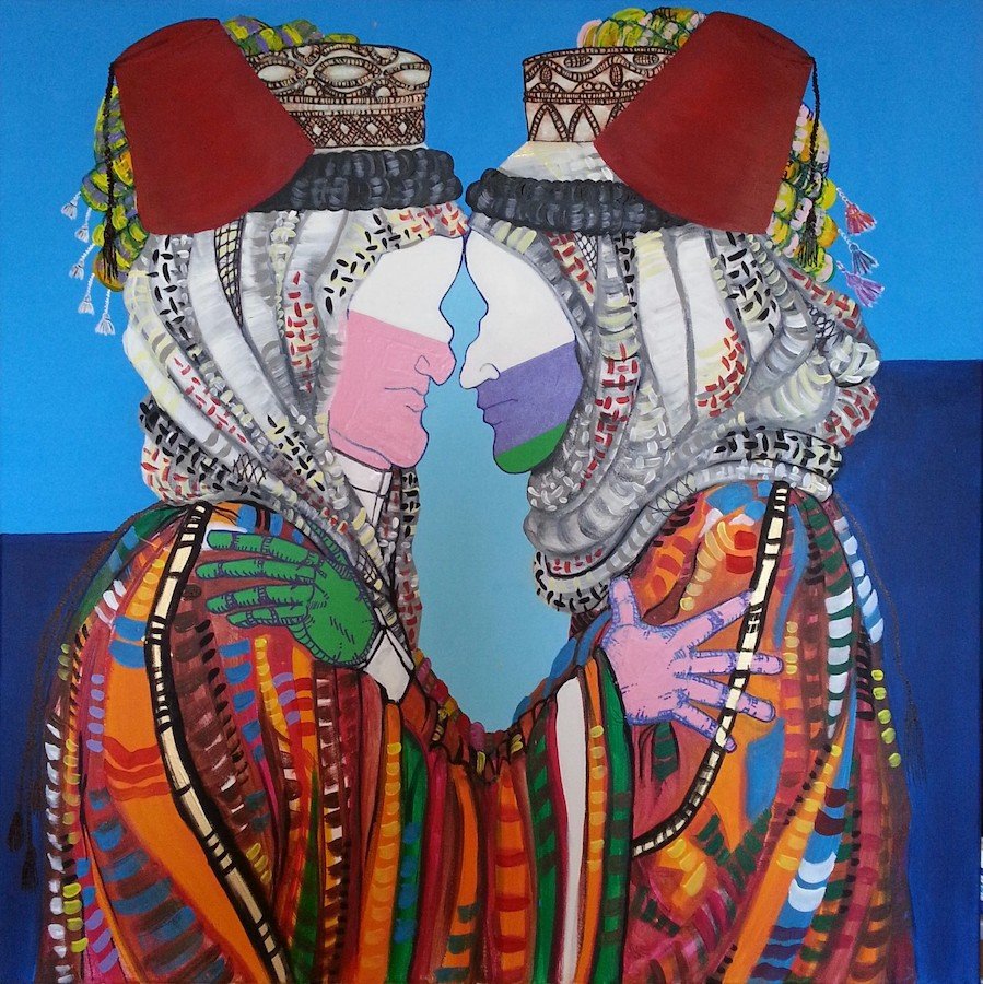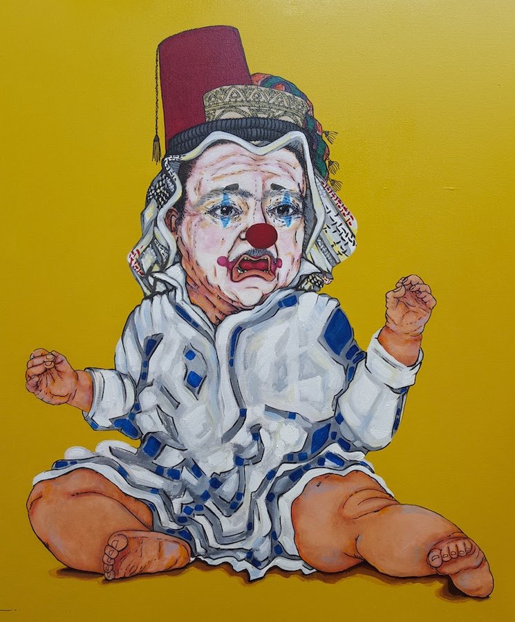 Cette toile a été créée en 2016, à la suite de tous les bouleversements au Moyen-Orient. Elle représente cela et exprime ce que je ressentais – c’est très littéral. Le vieil homme est à la fois un clown et un bébé. Nous pleurons parce que nous nous sentons impuissants, comme un bébé, et le clown apporte la joie, mais il pleure et n’est pas pris au sérieux. Il porte la coiffe traditionnelle, comme dans mes autres œuvres.