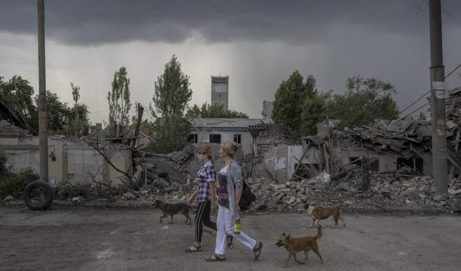 Des résidents locaux passent devant un bâtiment détruit à Toretsk, dans l'est de l'Ukraine (Photo, AFP).