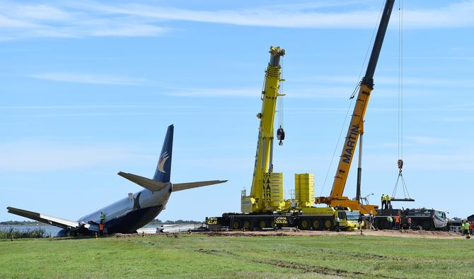 A l'aide de deux grues géantes, il a fallu soulever l'avion, le faire pivoter, puis le tracter jusqu'au tarmac pour le remorquer jusqu'aux abords d'un hangar où il restera immobilisé le temps de l'enquête, selon la direction de l'aéroport.