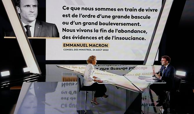 Dans cette capture d'écran réalisée à Paris le 26 octobre 2022, le président français Emmanuel Macron (à droite) s'exprime lors d'une interview de la journaliste et animatrice française Caroline Roux dans le cadre de l'émission "L'événement". (Photo de Ludovic MARIN / AFP)