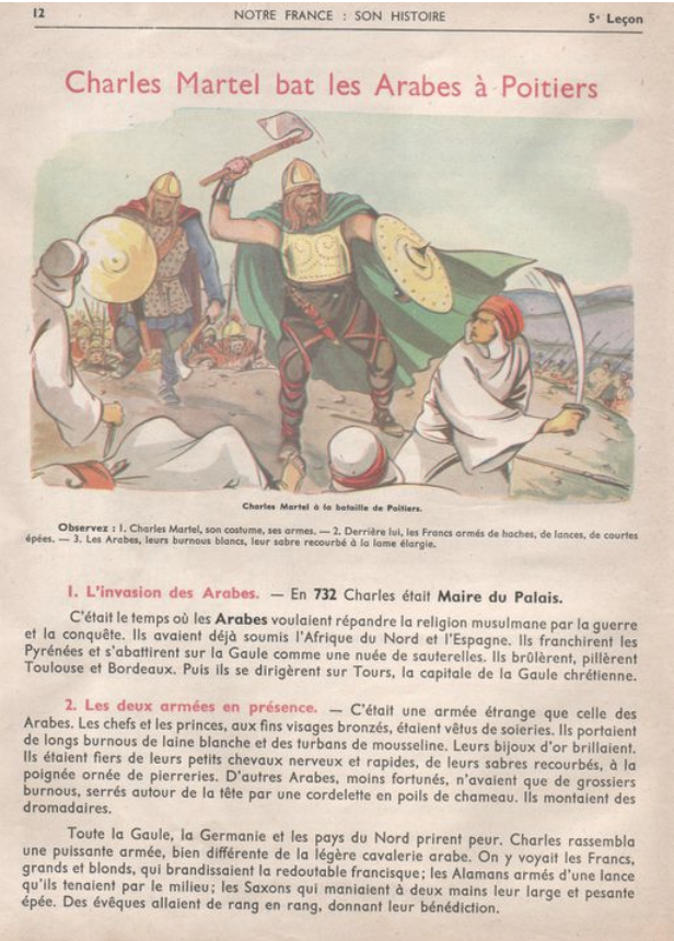 Pour revenir à Charles Martel… Voici ce que préconise un bloggeur spécialisé dans «les leçons et les mystères de l’Histoire»: «Veillons donc à transmettre à nos enfants nos bons vieux manuels ; ils n'étaient pas parfaits et quelques fois un peu mythiques ou simplistes, mais ceux d'aujourd'hui sont nuls.» (5) Et voici un exemple qu’il nous livre pour étayer son conseil: une page des fameux manuels, où l’on apprend que, sur le champ de bataille de Poitiers, les Arabes étaient montés sur des chameaux (sic). Or, la renommée de la cavalerie sarrasine était déjà faite, à l’époque, pour sa vélocité et son panache, ce que (détail négligé par nos historiens) leur permettait l’usage des étriers, dispositif inconnu alors des Francs et que les «Sarrasins» avaient emprunté aux Avars (peuple turco-mongol).