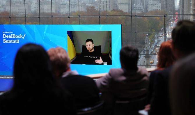 Le président ukrainien Volodymyr Zelensky s'entretient avec Andrew Ross Sorkin lors du sommet DealBook du New York Times dans la salle d'appel du Jazz At Lincoln Center le 30 novembre 2022 à New York. (AFP)
