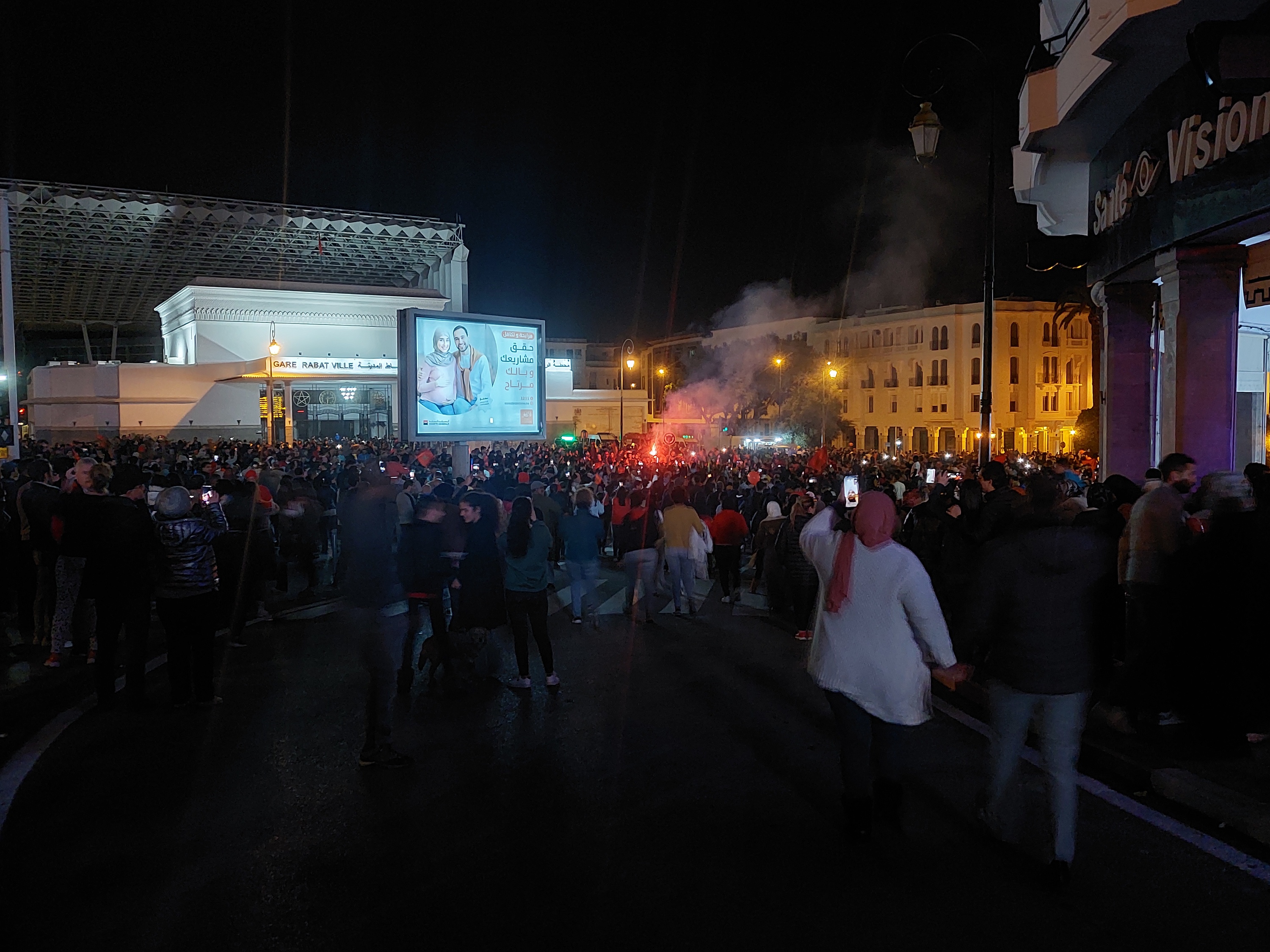 Peu après la conclusion de la rencontre, cette place est interdite à la circulation des quatre-roues pour accommoder les milliers de Marocains qui y affluent.