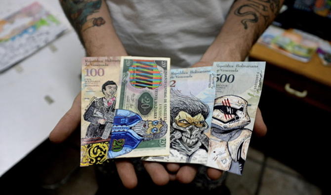 L'illustrateur vénézuélien Jose Leon, 26 ans, montre ses œuvres peintes sur des billets de bolivar dévalués (Photo, AFP).