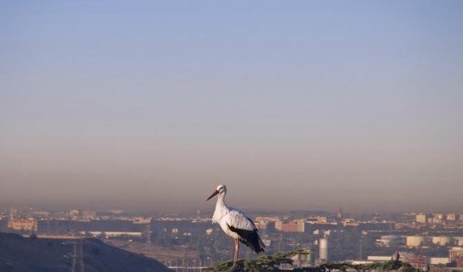 La pollution recouvre le ciel au-dessus de Madrid alors qu'une cigogne blanche (Ciconia Ciconia) se dresse au sommet d'un arbre dans un parc de la banlieue madrilène de Vallecas, le 8 octobre 2019. (AFP / Rafa RIVAS)