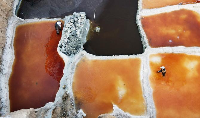 Le saunier Ibrahim Tagaji et un employé se démènent avec une barre à mine en cette fin de journée où la chaleur atteint les 45 degrés à l'ombre, au fond des bassines aux couleurs rouges et noires.
