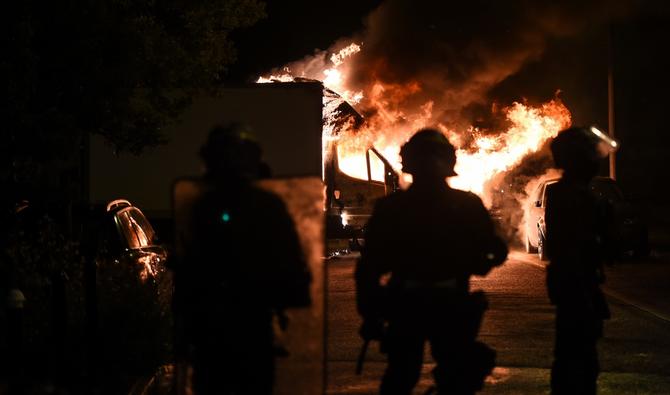 Des policiers anti-émeute français regardent un camion brûler à Nantes, dans l'ouest de la France, le 1er juillet 2023 (Photo, AFP).