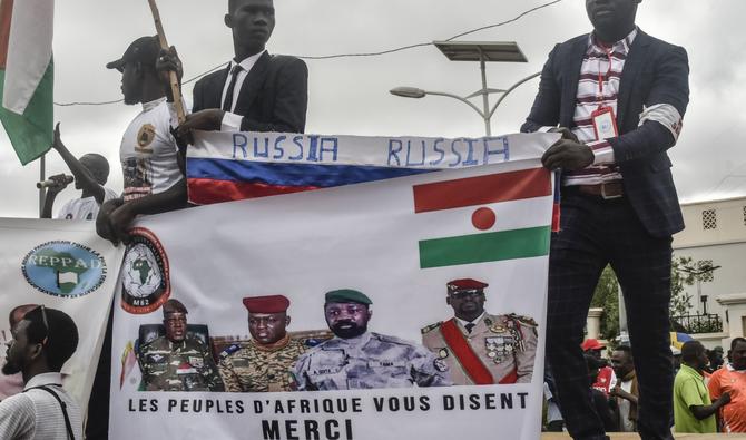 Des manifestants tiennent un drapeau russe et une bannière avec des images de (de gauche à droite): le général Abdourahamane Tiani, le nouvel homme fort du Niger, le chef de la junte burkinabé, le capitaine Ibrahim Traoré, le chef de la junte malienne, Assimi Goita, et le chef de la junte guinéenne, le colonel Mamady Doumbouya, lors d'une manifestation le jour de l'indépendance à Niamey le 3 août 2023 (Photo, AFP).