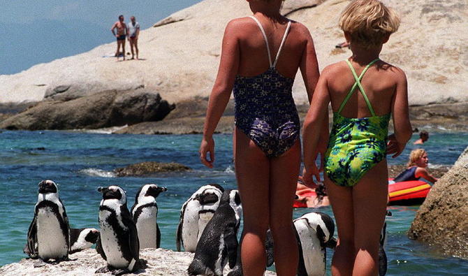 Un groupe de manchots de Jackass se prélasse sur un rocher tandis que les baigneurs vaquent à leurs occupations sur la plage de Boulders, au Cap, le 29 décembre. (Photo Anna Zieminski / AFP)