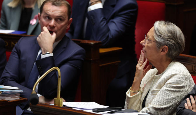 Le ministre français du Travail Olivier Dussopt (G) et la Première ministre française Elisabeth Borne assistent à une séance de questions au gouvernement à l'Assemblée nationale française à Paris, le 3 octobre 2023. (AFP)