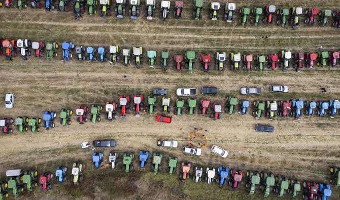 Cette photo aérienne montre des tracteurs garés dans un champ lors d'une manifestation contre la levée de l'interdiction des importations de céréales en provenance d'Ukraine, à Dolni Bogrov, près de Sofia, le 19 septembre 2023. (Photo Nikolay Doychinov AFP)