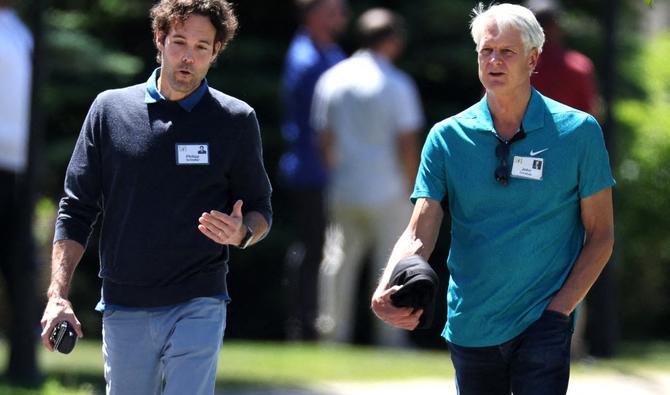 Philipp Schindler, directeur des ventes chez Google, et John Donahoe, PDG de Nike, quittent la session matinale de la conférence Allen & Company Sun Valley, le 12 juillet 2023 à Sun Valley, dans l'Idaho. (AFP)