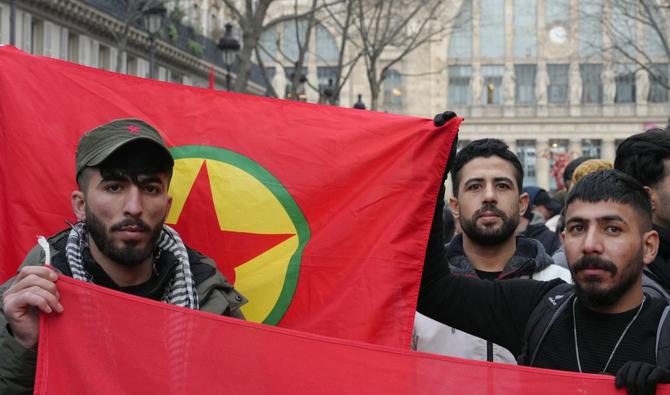 Un homme brandit un drapeau du Parti des travailleurs du Kurdistan (PKK) lors d'une manifestation organisée par la communauté kurde pour marquer l'anniversaire de la tuerie de la rue Enghien, à Paris (Photo, AFP).