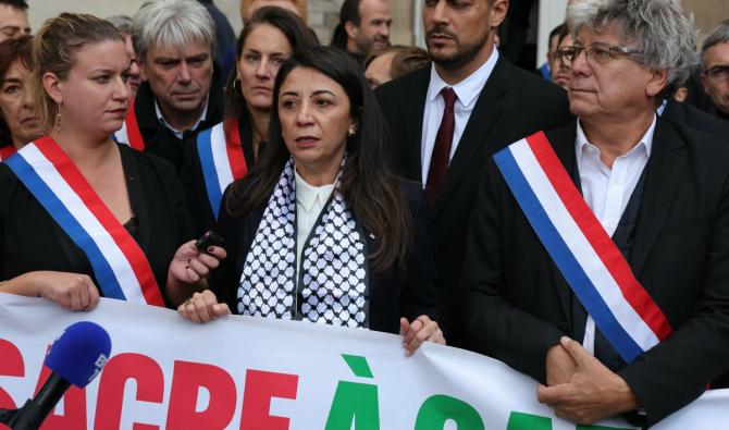 La représentante de l'Autorité palestinienne en France Hala Abou-Hassira (au centre) et la coalition de gauche NUPES - les députés du parti de gauche français La France Insoumise (LFI) Mathilde Panot (à gauche) et Eric Coquerel (à droite) se rassemblent à l'Assemblée nationale française à Paris le 7 novembre 2023, en tenant une banderole indiquant "Arrêtez le massacre à Gaza et en Cisjordanie, cessez le feu immédiatement". (Photo pThomas Samson AFP)