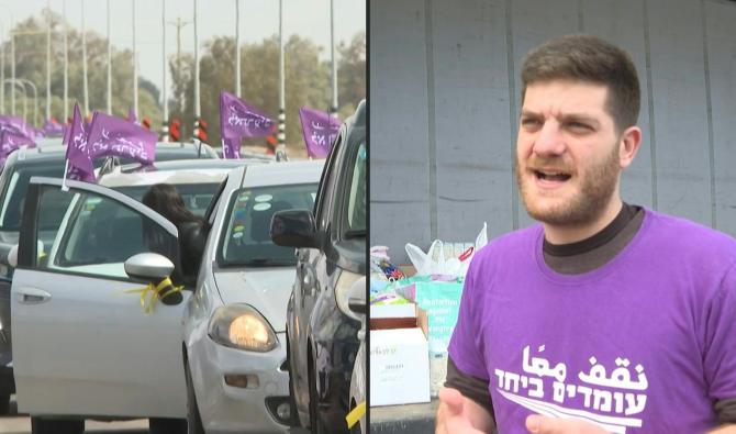 S'ils arborent pour la plupart des T-shirts violet avec l'inscription "N'affamez pas la population de Gaza!", tous prennent aussi soin d'attacher au rétroviseur de leur voiture le ruban jaune symbolisant la nécessité du retour des otages israéliens retenus encore à Gaza, qui sont encore 130 selon Israël, dont 31 seraient morts.
