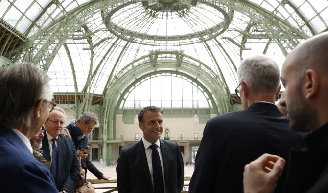 Le président français Emmanuel Macron (C) s'exprime lors d'une visite au Grand Palais, à Paris, le 15 avril 2024, à 100 jours des Jeux olympiques de Paris 2024 (AFP).