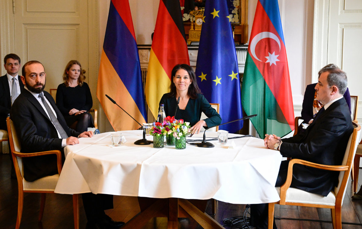 La ministre allemande des Affaires étrangères, Annalena Baerbock (C), accueille les ministres des Affaires étrangères de l'Arménie, Ararat Mirzoyan (G), et de l'Azerbaïdjan, Jeyhun Bayramov (D), pour des pourparlers de paix à Berlin, le 28 février 2024. (AFP/Dossier)