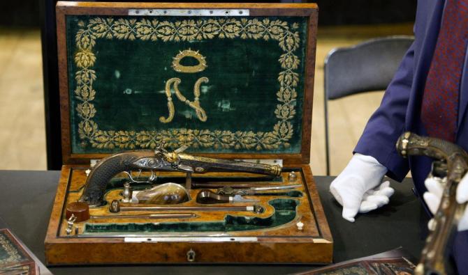 Vendus dans leur précieux coffret de bois (ronce de noyer, ébène, velours vert brodé d'or...) et avec leurs accessoires, "ces deux pistolets à percussion, incrustés d'or et d'argent, où le profil de l'empereur est représenté, sont estimés de 1,2 à 1,5 million d'euros", a précisé à l'AFP Jean-Pierre Osenat, expert.