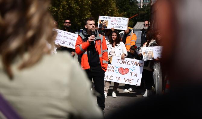 Un homme prend la parole lors d'une marche blanche commémorative à Grenoble, dans le sud-est de la France, le 15 septembre 2024, en hommage à l'employé municipal Lilian Dejean, tué par un chauffard à Grenoble le 8 septembre 2024. (AFP)